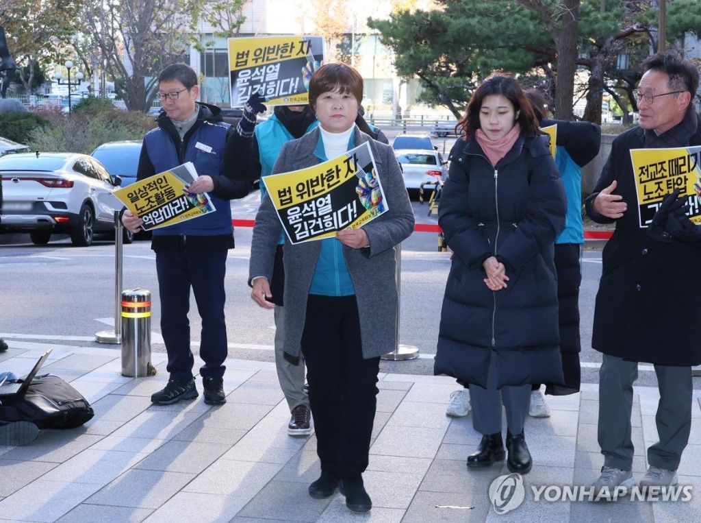 윤석열 대통령 퇴진 국민투표 참여를 독려한 혐의로 고발된 전희영 전국교직원노동조합(전교조) 위원장이 경찰에 출석했다.