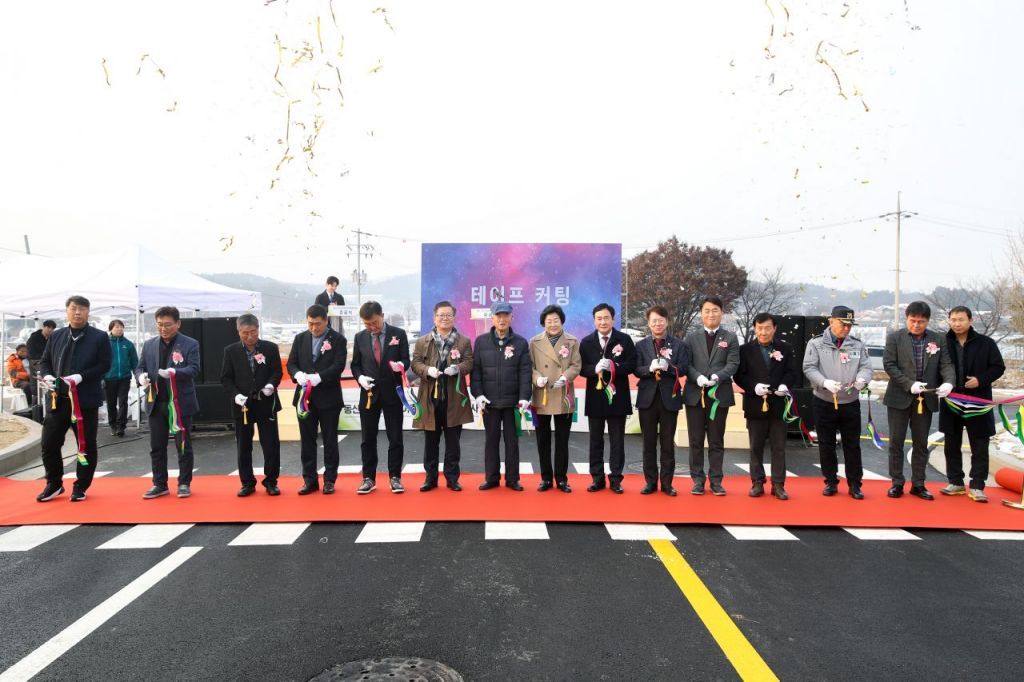 2일 개최된 이천시 호법면 동산~주미 간 농어촌도로 확포장공사 준공식에서 참석자들이 기념 테이프를 자르고 있다. 이천시 제공