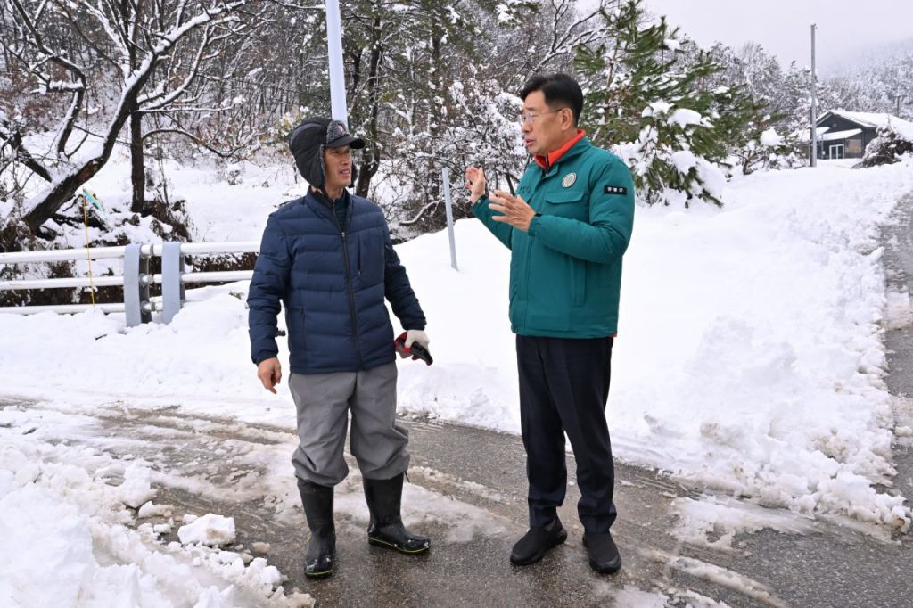 전진선 양평군수가 지난달 27일과 28일 내린 폭설 피해 농가를 찾아 피해 농민을 격려하고 있다. 양평군 제공