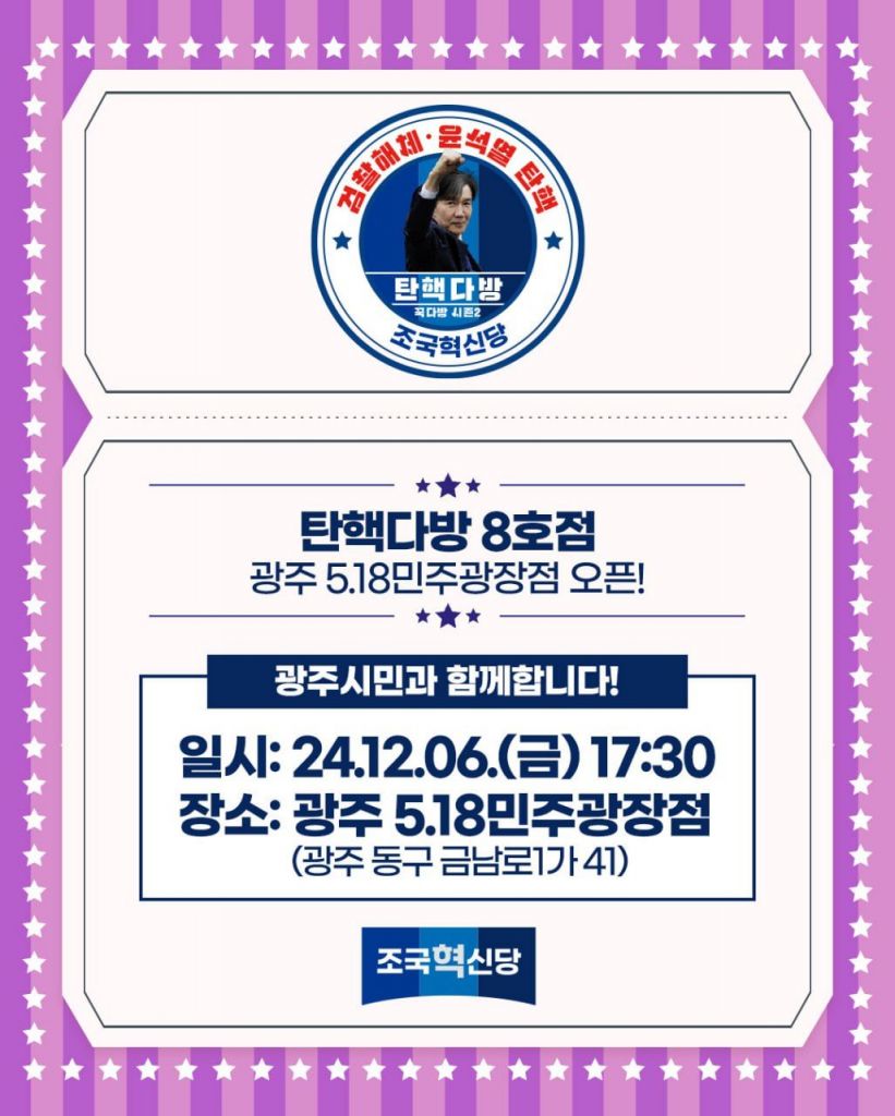 조국 조국혁신당 대표가 오는 6일 오후 광주 5·18민주광장에서 윤석열 대통령 탄핵 당위성을 설명하는 ‘탄핵다방’ 8호점을 개최한다. 조국혁신당 광주시당 제공