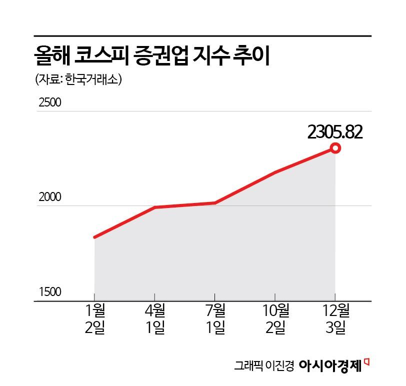 올해 증시 부진에도 증권주들의 주가는 양호했다. 코스피는 올들어 5.84% 하락했으나 증권업지수는 24.31% 올랐다. 특히 하반기 이후 주가 약세가 지속되면서 거래대금이 위축되는 등 어려운 상황에서도 증권주들은 양호한 주가 흐름을 이어가는 모습이다. 정태준 미래에셋증권 연구원은 "증시 부진으로 국내 주식 거래대금과 신용공여 잔고까지도 감소세를 거듭하고 있다"면서 "4분기 누적 평균 국내 주식 거래대금은 전분기 대비 10.1% 감소한 16조4000억원까지 하락했으며 미국 대선 직전에는 13조1000억원까지 감소하는 모습을 보이기도 했다"고 분석했다.