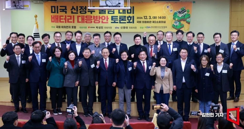 추경호 국민의힘 원내대표를 비롯한 참석자들이 3일 국회 의원회관에서 열린 이차전지포럼 주최 '미국 신정부 출범 대비 배터리 대응방안 토론회'에서 기념촬영를 하고 있다.