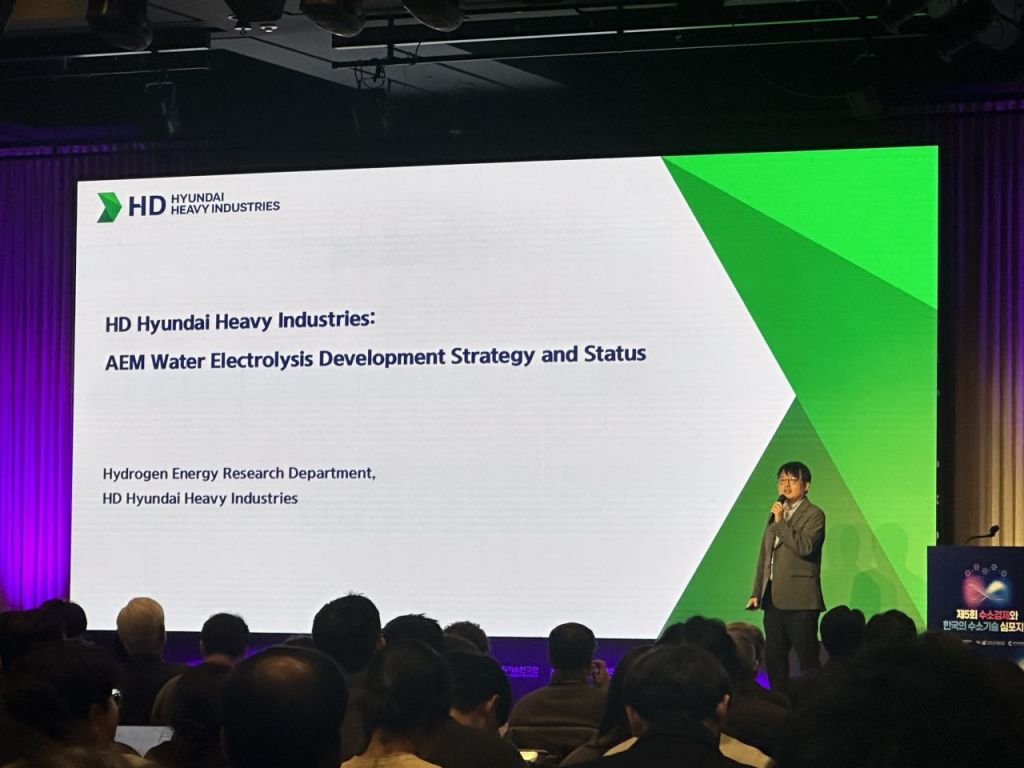 이상돈 HD현대중공업 수소에너지연구실장이 3일 서울 강남구 아모리스 역삼에서 진행된 '수소경제와 한국의 수소기술 심포지엄'에서 HD현대중공업의 음이온교환막 수전해 개발 현황 및 전략에 대해 발표하고 있다. 이성민 기자