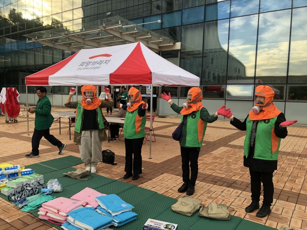 재해구호 전문인력 양성교육에 참여한 교육생들이 화재대피 및 화생방교육 실습을 하고 있다. 희망브리지 제공