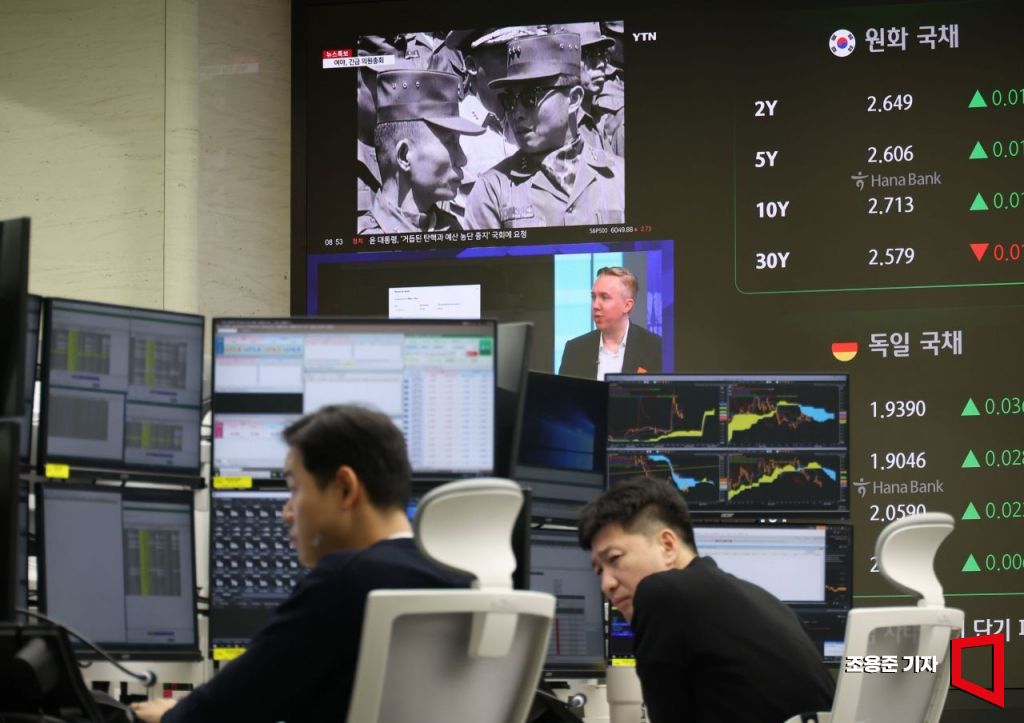 윤석열 대통령이 비상계엄을 선언했다 국회의 의결로 계엄을 해제한 4일 오전 서울 중구 하나은행 딜링룸 모니터에 계엄 관련 뉴스가 나오고 있다. 비상계엄 영향으로 이날 코스피는 -1.97%, 환율은 1418원으로 출발했다.