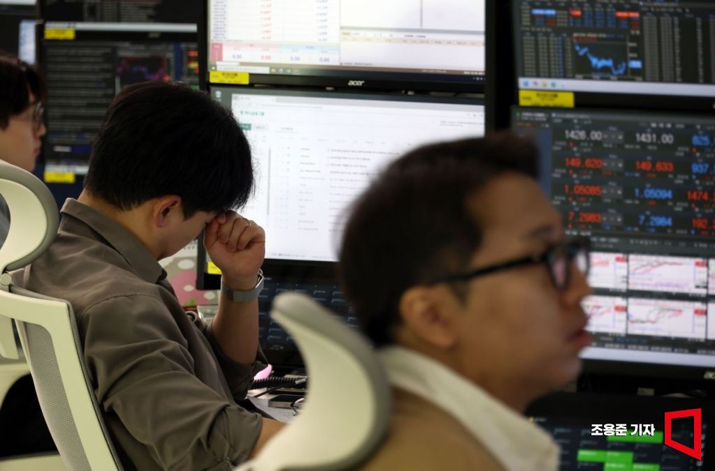 윤석열 대통령이 비상계엄을 선언했다 국회의 의결로 계엄을 해제한 4일 서울 중구 하나은행 딜링룸 관계자들이 굳은 표정을 짓고 있다. 이날 비상계엄 영향으로 코스피는 -1.97%, 환율 1418원으로 출발했다.