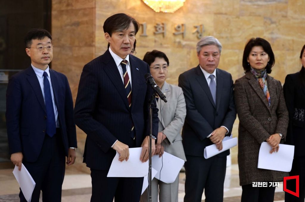 조국 조국혁신당 대표가 4일 국회 본회의장 앞에서 열린 '3년은너무길다 특별위원회-의원총회 연석회의'에서 발언하고 있다.