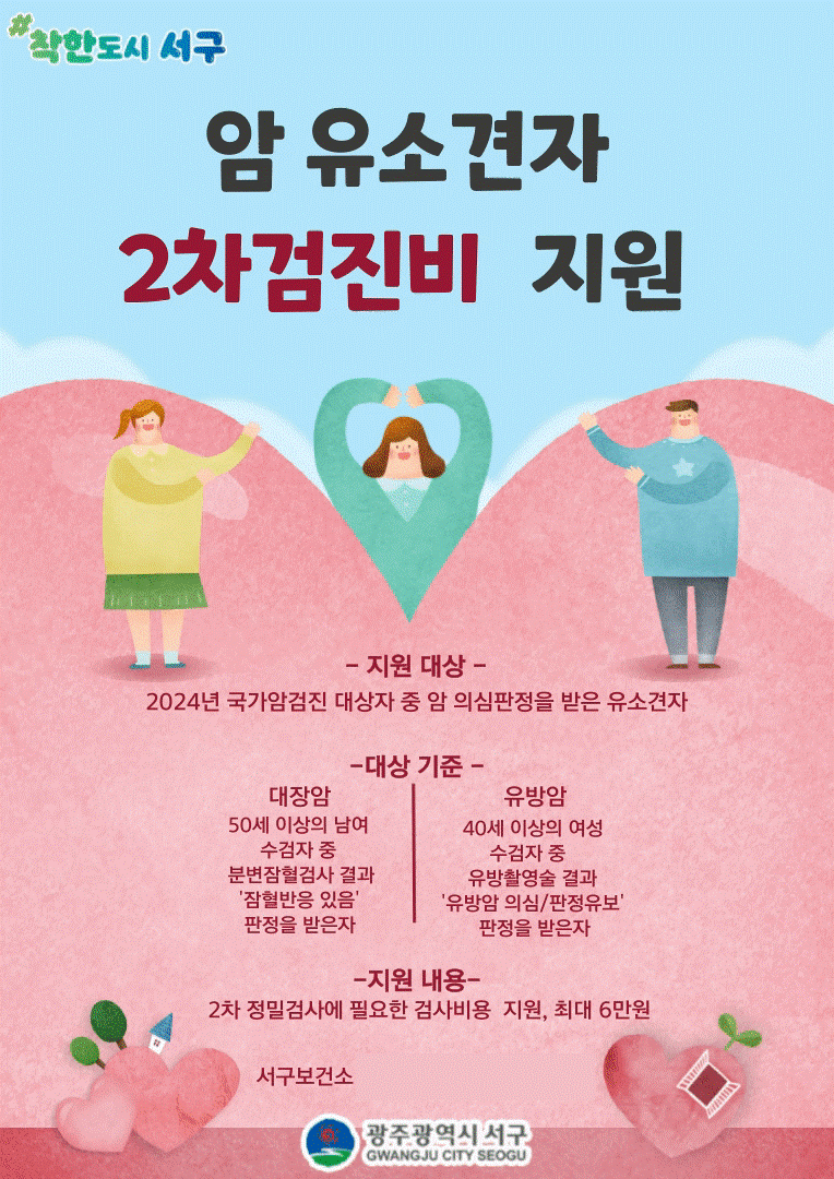 광주시 서구(구청장 김이강)는 국가암검진 수검자 중 대장암 또는 유방암 의심 판정을 받은 유소견자에게 2차 정밀검사비를 지원한다고 4일 밝혔다.