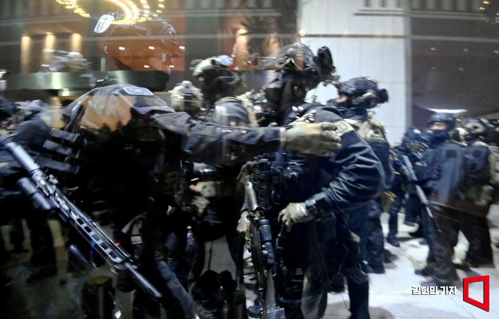 윤석열 대통령이 3일 밤 비상계엄을 선포한 가운데 4일 새벽 계엄군이 국회 본청 진입을 시도하고 있다. 김현민 기자