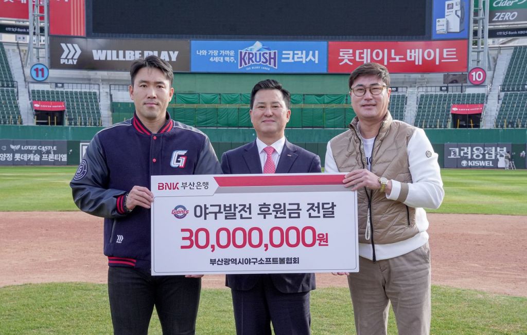 BNK부산은행(은행장 방성빈)이 지난 3일 부산 사직구장에서 ‘부산광역시야구소프트볼협회’에 유소년 야구부 후원금 3000만원을 전달했다.