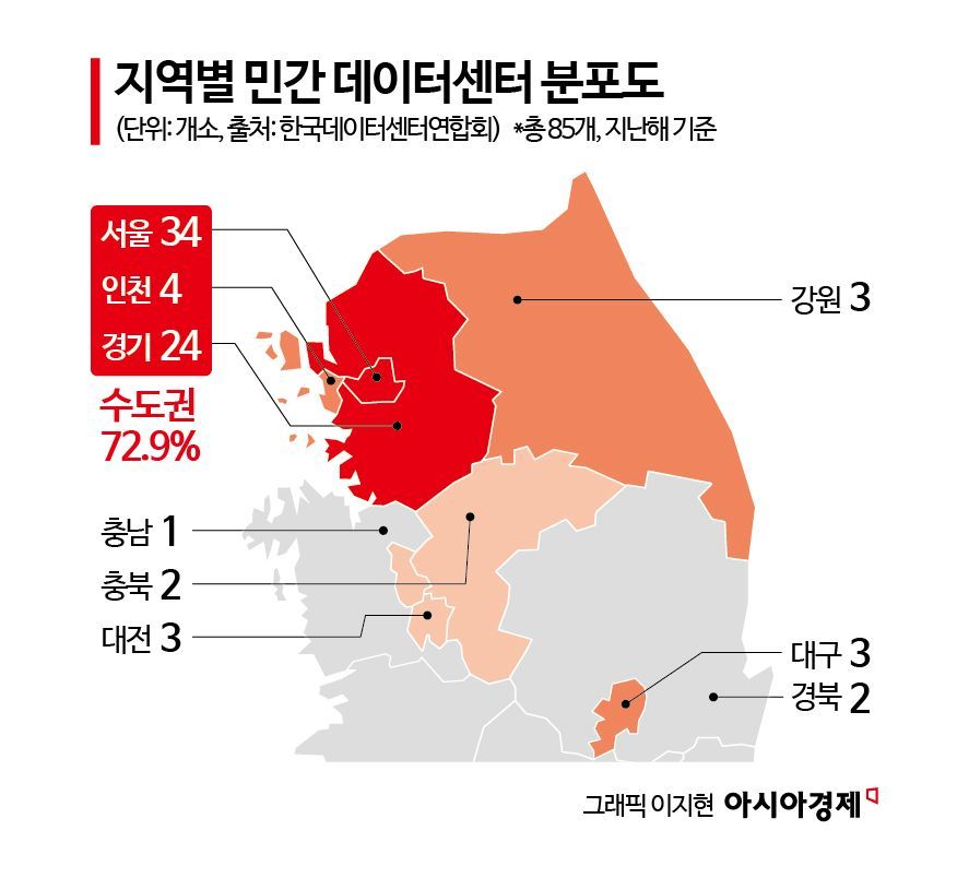 9일 데이터센터 업계에 따르면 현재 민간 데이터센터의 72.9%는 수도권에 집중돼 있다. 이는 전력 계통에 부담을 주고, 최악의 상황에는 블랙아웃과 같은 전력난이 발생할 수 있다는 게 정부 입장이다. 수도권에 집중된 데이터센터는 재난 발생 시 데이터 손실이나 인터넷 지연 등의 문제를 초래할 가능성도 우려된다. 이를 방지하기 위해 데이터센터를 수도권 이외 지역으로 분산시켜야 한다는 것이다.