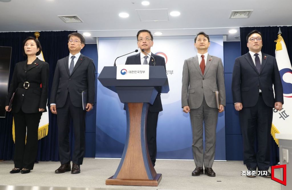 최상목 경제부총리 겸 기획재정부 장관, 안덕근 산업자원통상부 장관, 박상우 국토교통부 장관, 오영주 중소벤처기업부 장관, 김병환 금융위원장이 4일 서울 종로구 정부서울청사에서 열린 긴급 경제관계장관회의 합동브리핑을 하고 있다.