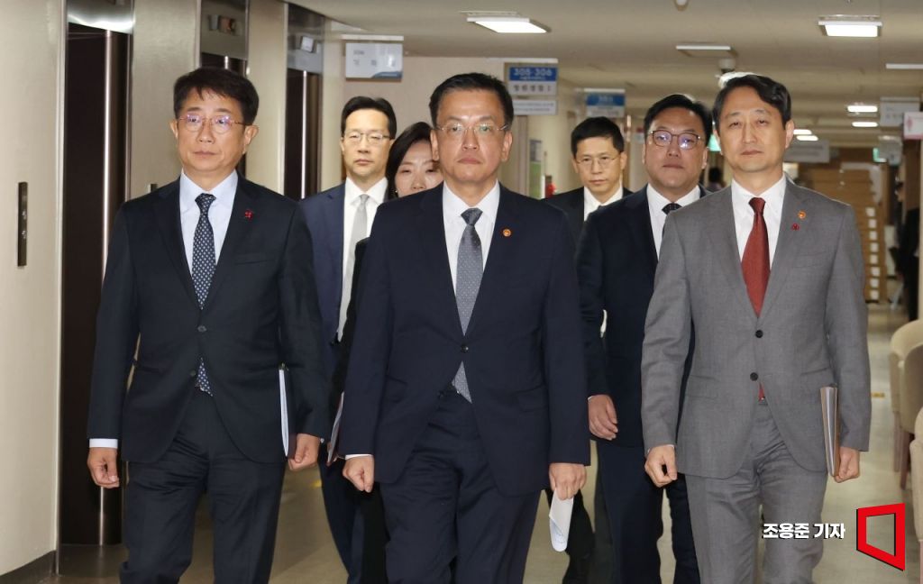 최상목 부총리 겸 기획재정부 장관이 4일 관계장관들과 서울 종로구 정부서울청사에서 열리는 긴급 경제관계장관회의 합동브리핑에 참석하고 있다.