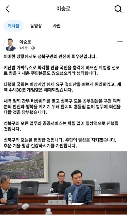윤석열 대통령의 ‘비상계엄 선포’ 사태와 관련해 4일 이승로 서울 성북구청장은 “어떠한 상황에서도 성북구민의 안전이 최우선”이라며 “공무원들이 구민의 안전과 행복을 지키기 위해 한 치의 흔들림 없이 업무에 최선을 다해달라”고 당부했다.