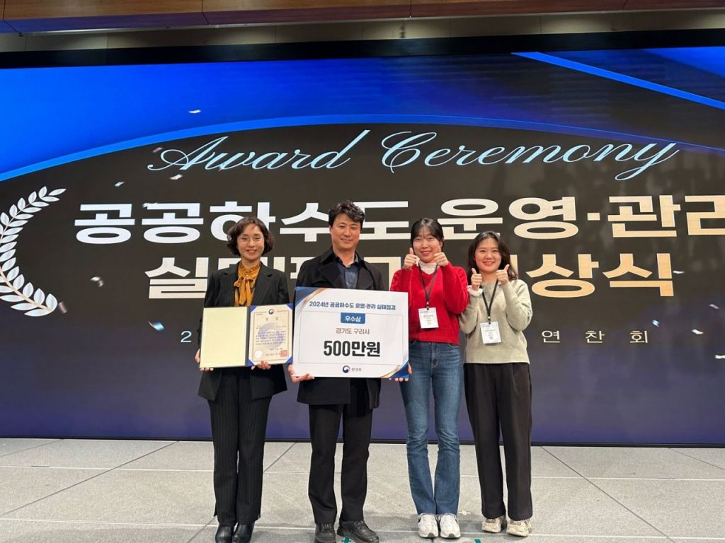 구리시가 환경부 주관 공공하수도 운영관리 실태평가와 한강유역환경청 주관 한강수계관리기금사업 성과평가에서 모두 ‘우수기관’으로 선정돼 수상을 하고 있다. 구리시 제공