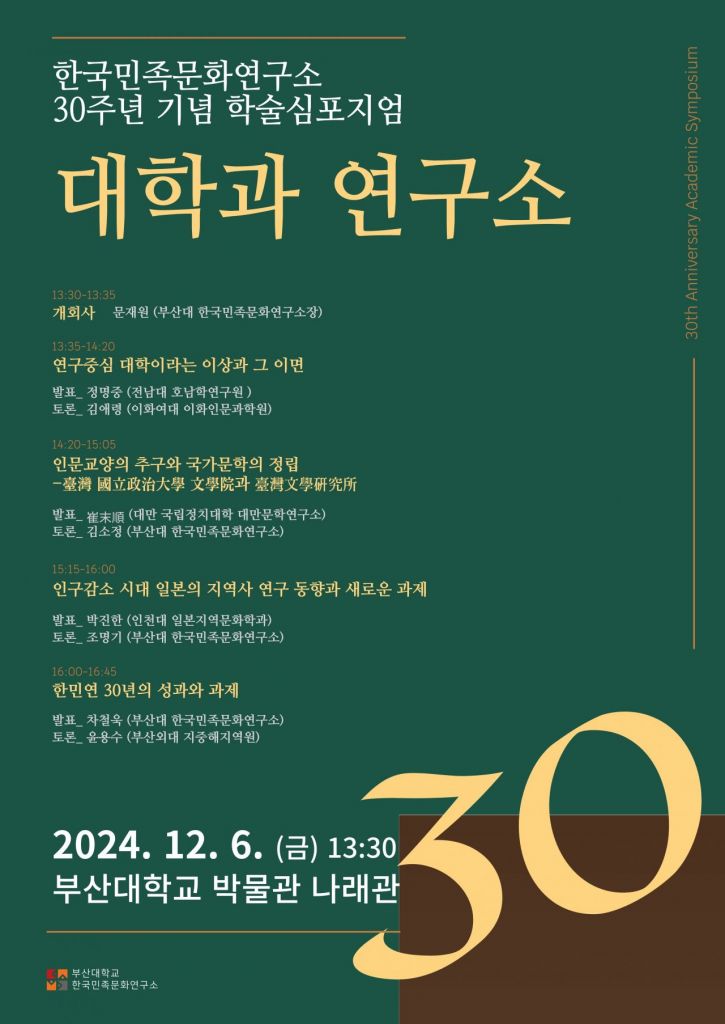 부산대 한국민족문화연구소 30주년 기념 학술 심포지엄·기념식 포스터.
