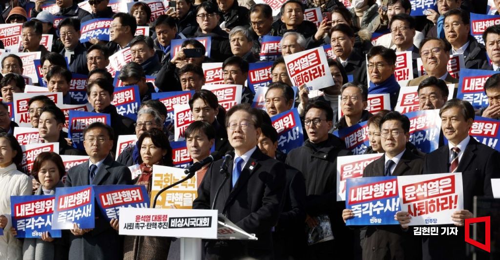 이재명 더불어민주당 대표가 4일 국회 본청 앞 계단에서 열린 '윤석열 대통령 사퇴촉구 탄핵추진 비상시국대회'에서 발언하고 있다.