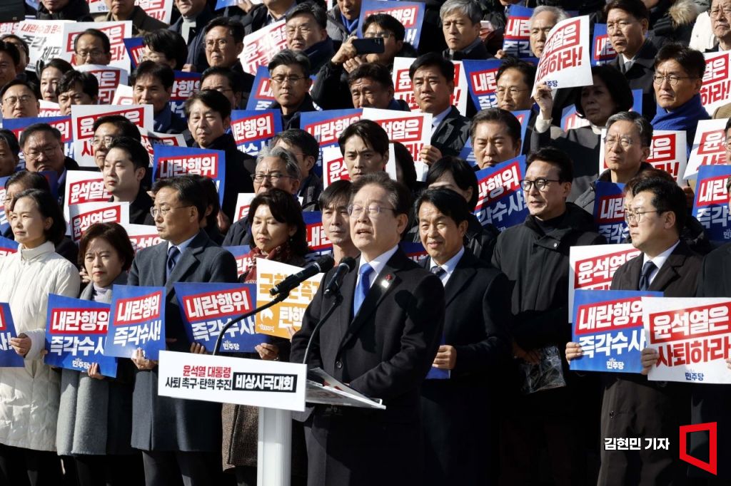이재명 더불어민주당 대표가 4일 국회 본청 앞 계단에서 열린 '윤석열 대통령 사퇴촉구 탄핵추진 비상시국대회'에서 발언하고 있다.