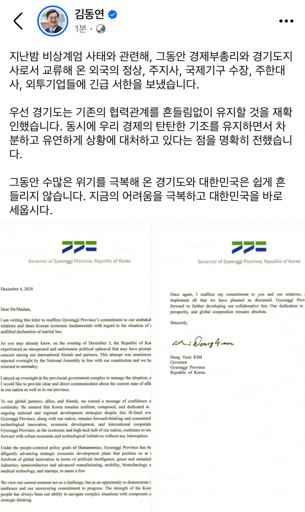 김동연 경기도지사가 3일 밤 비상계엄 사태와 관련, 그동안 경제부총리와 경기도지사로서 교류해 온 외국의 정상, 주지사, 국제기구 수장, 주한대사, 외투기업들에 긴급 서한을 보냈다.