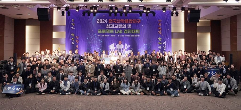 국립목포대학교 전남대불산학융합원 학생들이 2024년 전국 산학융합지구 성과교류회 및 프로젝트 Lab 경진대회가 끝난 뒤 단체 기념 사진 촬영을 하고 있다. 국립목포대학교 제공