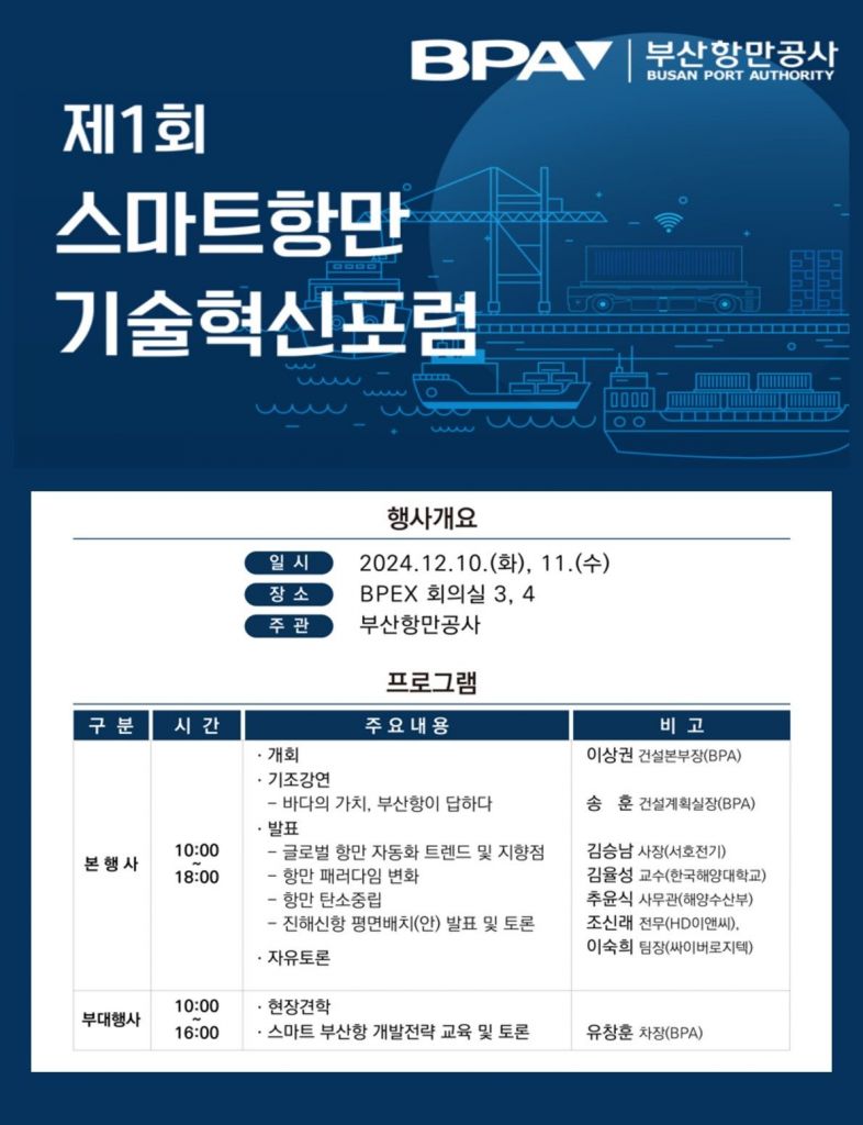 부산항만공사(BPA, 사장 강준석)는 10일과 11일 부산항국제전시컨벤션센터(BPEX)에서 ‘제1회 스마트항만 기술혁신포럼’을 개최한다.