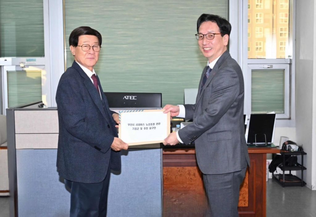 정종복 기장군수(왼쪽)가 강희성 부산시 교통혁신국장에게 부산시 시내버스 노선 조정 관련 기장군 및 주민 요구안을 전달하고 있다.