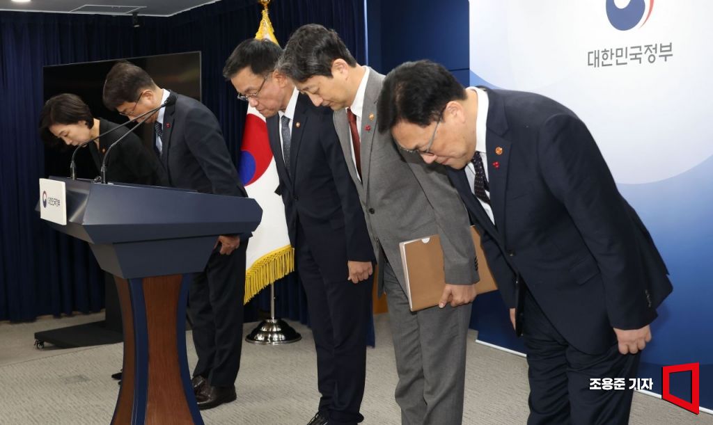 최상목 경제부총리 겸 기획재정부 장관, 안덕근 산업자원통상부 장관, 박상우 국토교통부 장관, 오영주 중소벤처기업부 장관, 김병환 금융위원장이 4일 서울 종로구 정부서울청사에서 열린 긴급 경제관계장관회의 합동브리핑에서 인사하고 있다.