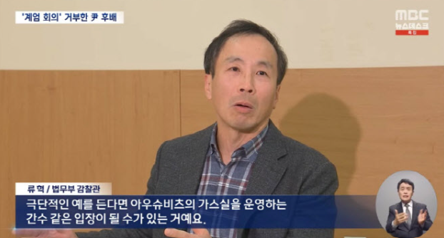 4일 류 감찰관은 MBC에 “이것이 국헌 문란이 아니면 무엇이겠느냐”며 “혼자만의 위기 상황이라고 주장하는 이런 착각 속에서, 개인의 안위를 국가의 안위와 혼동하는 이런 정신 착란에 가까운 판단하에서 이 계엄을 선포한 것”이라고 말했다.