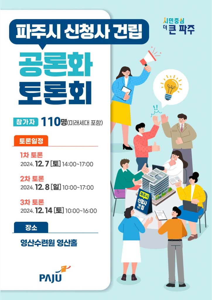 7일 첫 번째 공론화 토론회에서는 전문가 발제를 시작으로 공론화 목적과 과정을 이해하는 시간을 갖고, 시민이 바라는 100만 시대 파주시 미래에 대한 시민 토론이 진행된다.