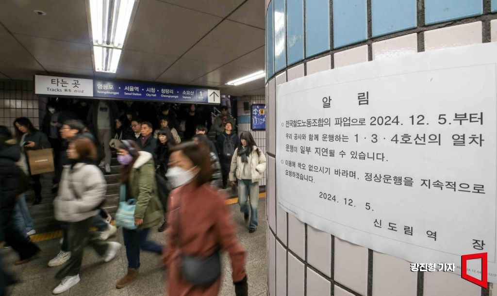 철도노조가 임금 2.5% 인상과 4조 2교대 전면 실시 등을 요구하며 총파업에 돌입한 5일 서울 구로구 지하철 1호선 신도림역에 파업으로 인한 열차지연 안내문이 붙어 있다.