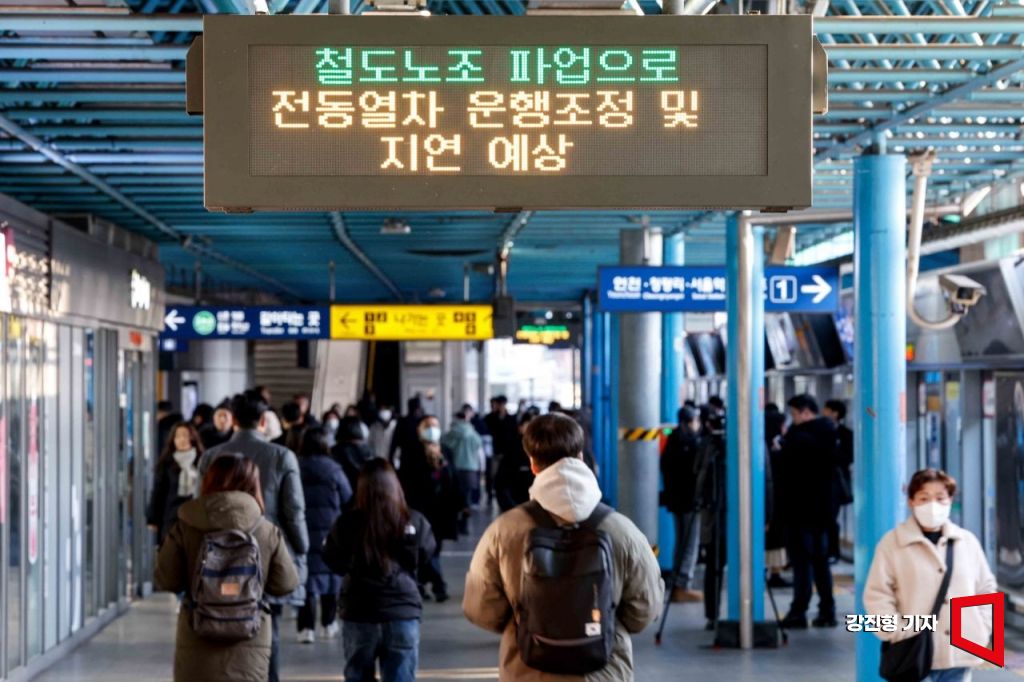 철도노조가 임금 2.5% 인상과 4조 2교대 전면 실시 등을 요구하며 총파업에 돌입한 5일 서울 구로구 지하철 1호선 신도림역 승강장 전광판에 전동열차 운행조정 및 지연이 안내되고 있다.