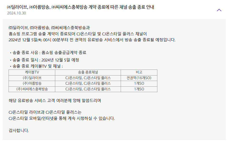 CJ온스타일은 5일 자정부터 딜라이브, 아름방송, 씨씨에스충북방송 등 SO에 대한 채널 송출을 중단했다. CJ온스타일은 지난 10월30일 홈페이지를 통해 "홈쇼핑 프로그램 송출 계약이 종료돼 CJ온스타일 및 CJ온스타일 플러스 채널의 방송 송출이 종료될 것"이라고 공지를 올린 바 있다.