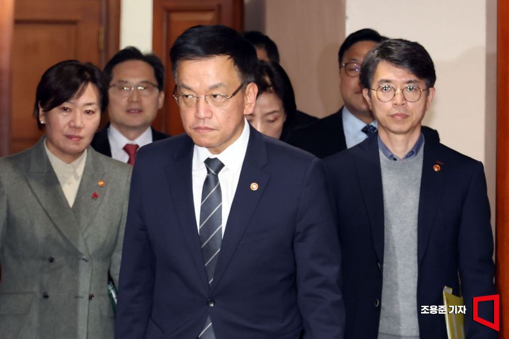 5일 서울 종로구 정부서울청사에서 국무위원들 사의 표명 후 처음 열린 경제관계장관 회의에서 최상목 경제부총리 겸 기획재정부 장관을 비롯한 국무위원들이 입장하고 있다.