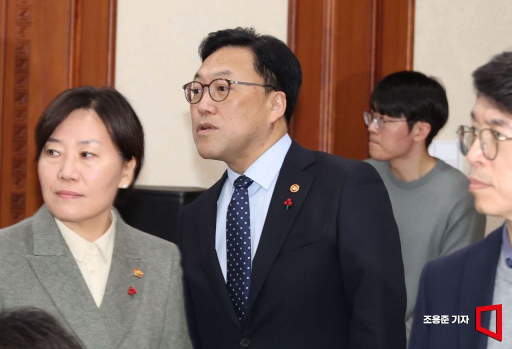 5일 서울 종로구 정부서울청사에서 국무위원들 사의 표명 후 처음 열린 경제관계장관 회의에서 김병환 금융위원장, 송미령 농림축산부 장관이 참석하고 있다.