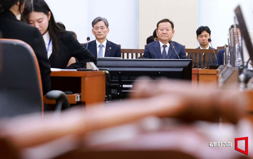 이상민 행정안전부 장관과 조지호 경찰청장이 5일 국회 행정안전위원회에서 열린 계엄 당시 경찰의 대응과 관련한 긴급 현안질의에 출석하고 있다.