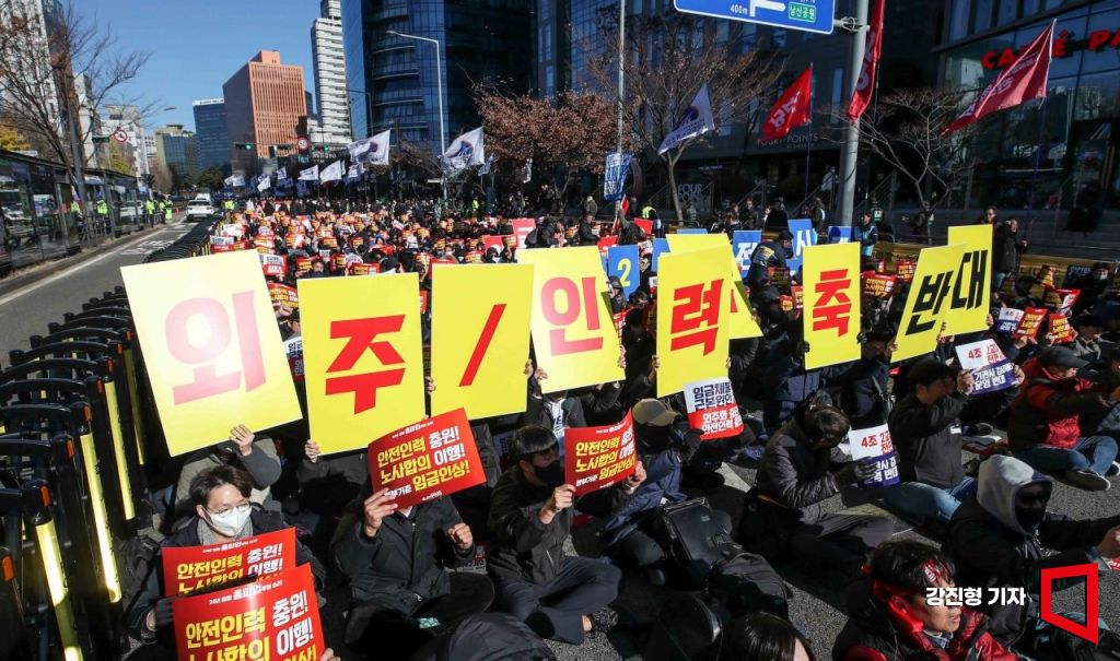 5일 서울 중구 서울역 인근에서 철도노조 조합원들이 총파업 출정식을 열고 임금 2.5% 인상과 4조 2교대 전면 실시 등을 촉구하고 있다.