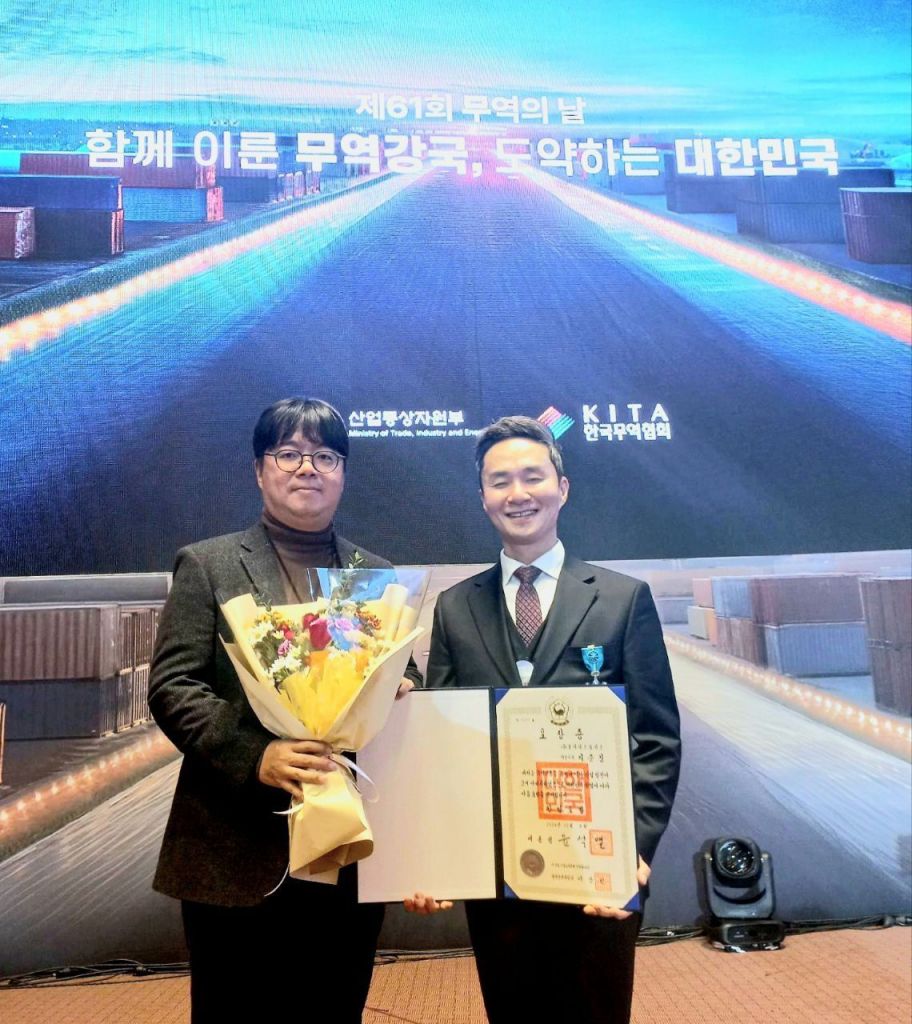 5일 서울 코엑스에서 개최된 ‘제61회 무역의 날’ 유공자 시상식에서 (왼쪽부터) 폴라리스오피스 이해석 부사장, 지준경 대표이사가 기념 사진을 촬영하고 있다. 폴라리스오피스 제공.