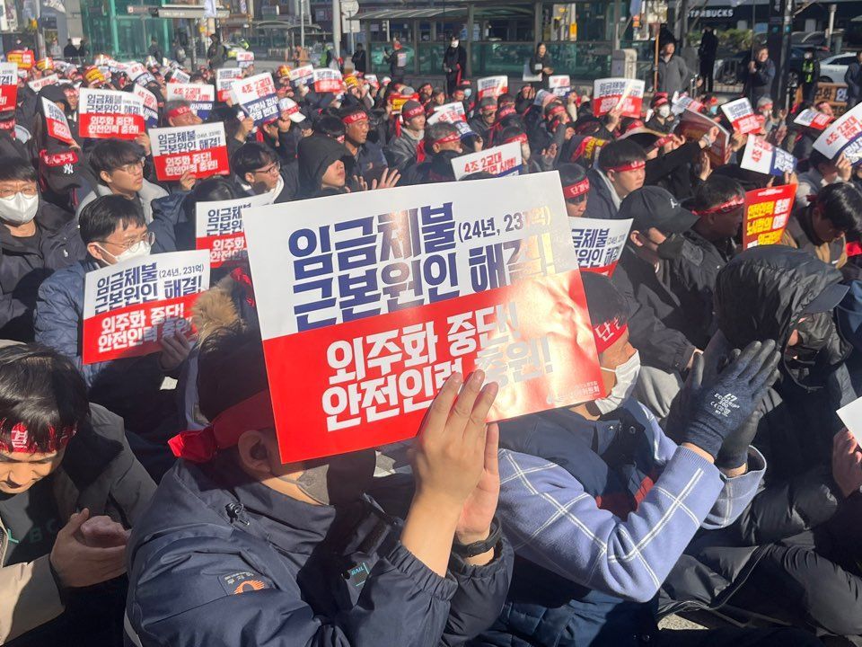 5일 오후 2시 광주송정역에서 열린 철도노조 총파업 출정식에서 공공운수노조 철도노조 호남본부 1,000여명 노동자가 임금인상, 인력감축·외주화 반대 등을 촉구하며 구호를 외치고 있다.