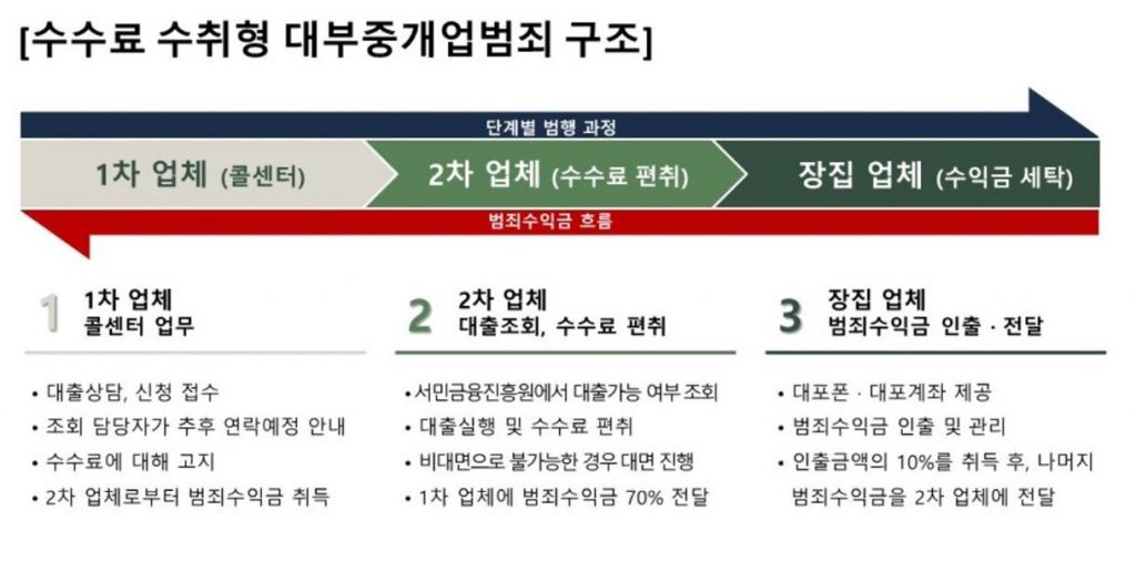 이들은 1차 콜센터, 2차 실행조직, 3차 수익금 세탁조직 등으로 조직적으로 움직였다. 1차 콜센터가 사회관계망서비스(SNS) 배너광고를 통해 대출을 신청한 피해자들을 모집하고 이들을 대상으로 대출 상담을 진행하면 2차 실행 조직이 피해자의 정보를 넘겨받아 대출 가능 여부를 조회 및 실행하면서 대출금의 20%를 수수료로 입금하라고 요구했다. 이어 3차 조직이 2차 업체에 대포계좌와 대포폰을 제공하면서 일정 기간 수수료가 입금되면 자금을 세탁해 2차 업체에 현금으로 전달하고 2차 업체는 다시 1차 업체로 전달하는 방식으로 범행을 이어간 것으로 조사됐다.