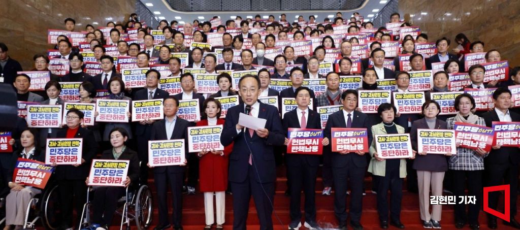 추경호 국민의힘 원내대표와 의원들이 5일 국회 로텐더홀 계단에서 감사원장과 검사들에 대한 탄핵 추진 규탄대회를 하고 있다.
