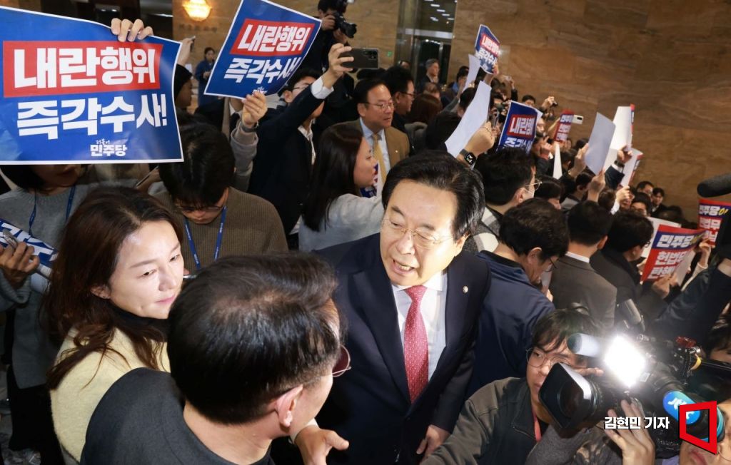 국민의힘 의원들과 당 관계자들이 5일 국회 로텐더홀 계단에서 감사원장과 검사들에 대한 탄핵 추진 규탄대회를 하던 중 본회의에 참석하던 민주당 몇몇 의원들이 항의하며 고성이 오가고 있다.