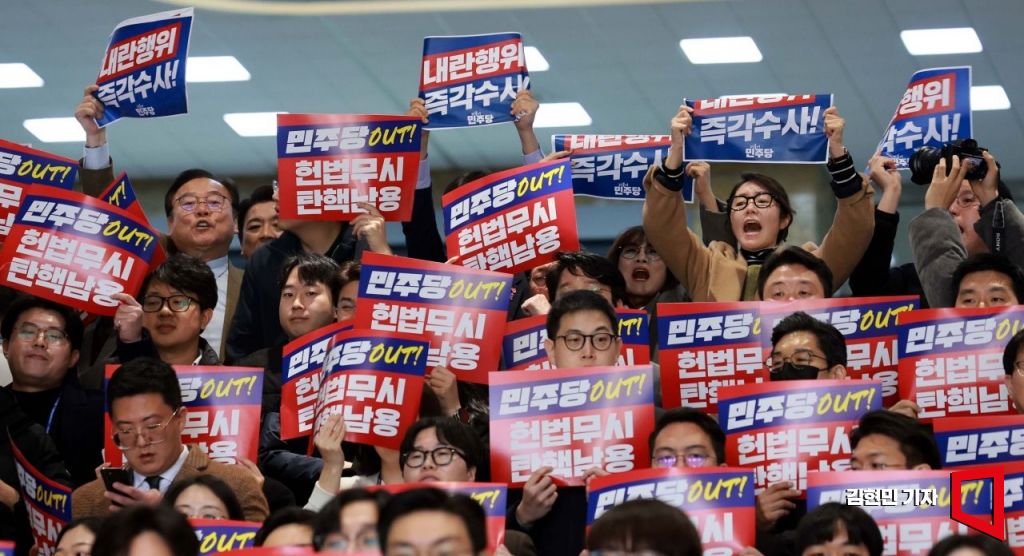 국민의힘 의원들과 당 관계자들이 5일 국회 로텐더홀 계단에서 더불어민주당의 감사원장과 검사들에 대한 탄핵 추진 규탄대회를 하던 중 본회의에 참석하던 민주당 몇몇 의원들이 손팻말을 들어 항의하고 있다.
