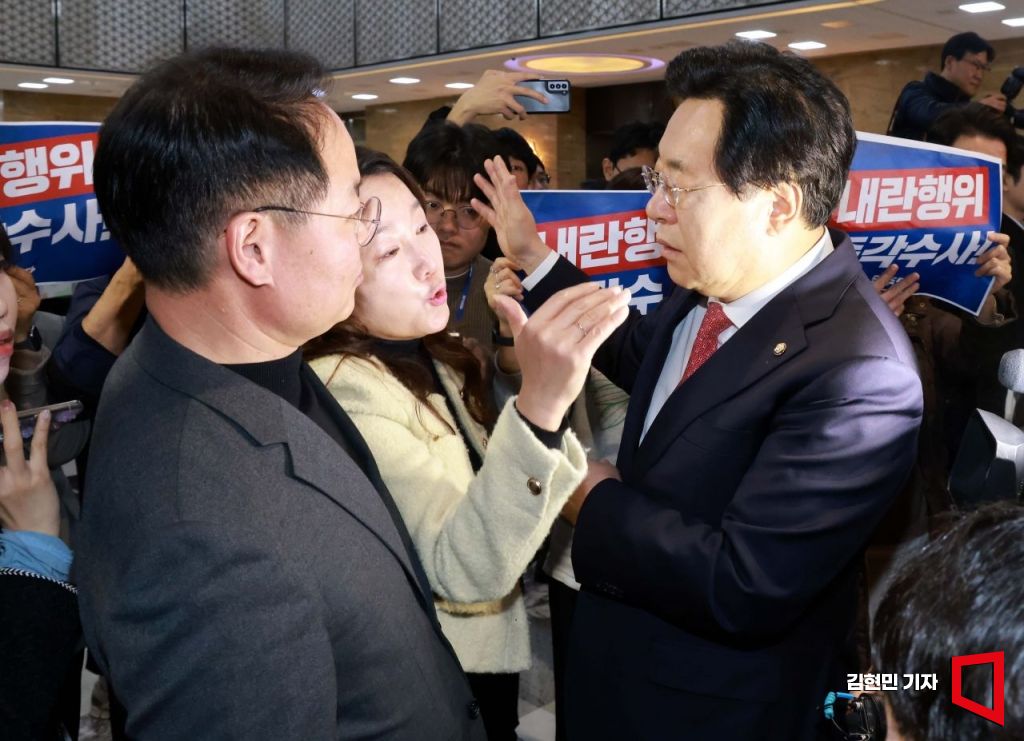 국민의힘 의원들과 당 관계자들이 5일 국회 로텐더홀 계단에서 감사원장과 검사들에 대한 탄핵 추진 규탄대회를 하던 중 본회의에 참석하던 민주당 몇몇 의원들이 항의하며 고성이 오가고 있다.