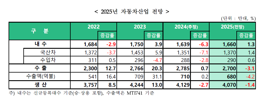 보고서에 따르면 올해 내수 자동차 시장은 경기부진 지속, 고금리, 높은 가계부채 등으로 소비심리가 위축된 영향을 받았다. 신차 구매 의향도 감소 추세였고, 전기차 판매 부진까지 계속됐다. 생산 차질까지 겹치며 내수 판매는 지난해보다 6.3% 줄어든 164만대로 추정됐다.