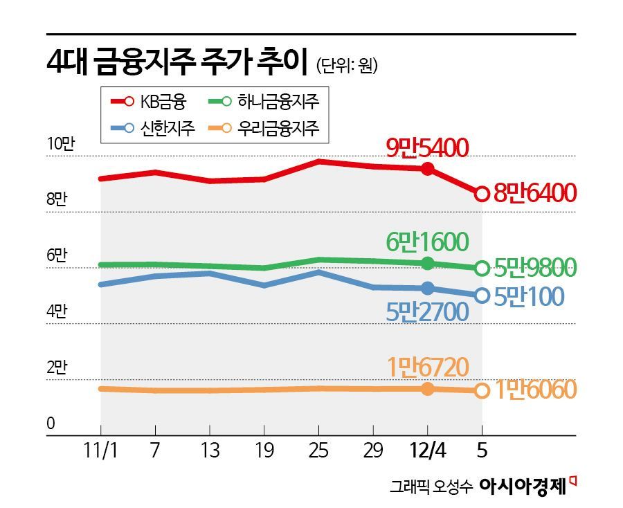 6일 한국거래소에 따르면 지난 4일 KB금융은 5.7% 하락했다. 신한지주와 하나금융지주도 각각 -6.6%, -6.7% 빠졌고 우리금융지주도 2.7% 약세로 장을 마감했다. 전날에도 하락세를 이어가며 KB금융 -10%, 신한지주 -5.5%, 우리금융지주 -3.7%, 하나금융지주 -3.2% 등으로 거래를 마쳤다.