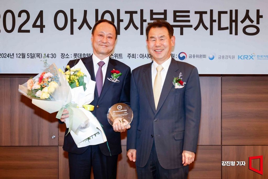 윤만철 KB증권 고객솔루션 총괄본부장이 5일 서울 중구 롯데호텔에서 열린 '2024 아시아자본투자대상 시상식'에서 WM부문 한국거래소이사장상을 수상하고 있다.