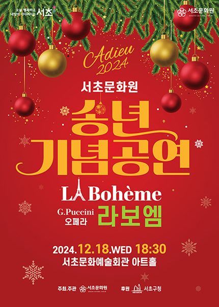 세계적인 오페라 거장 푸치니의 서거 100주년을 기념해 진행되는 이번 공연에서는 크리스마스의 낭만을 담은 예술가들의 아름답고 슬픈 러브스토리 ‘오페라 라보엠’이 진행될 예정이다.