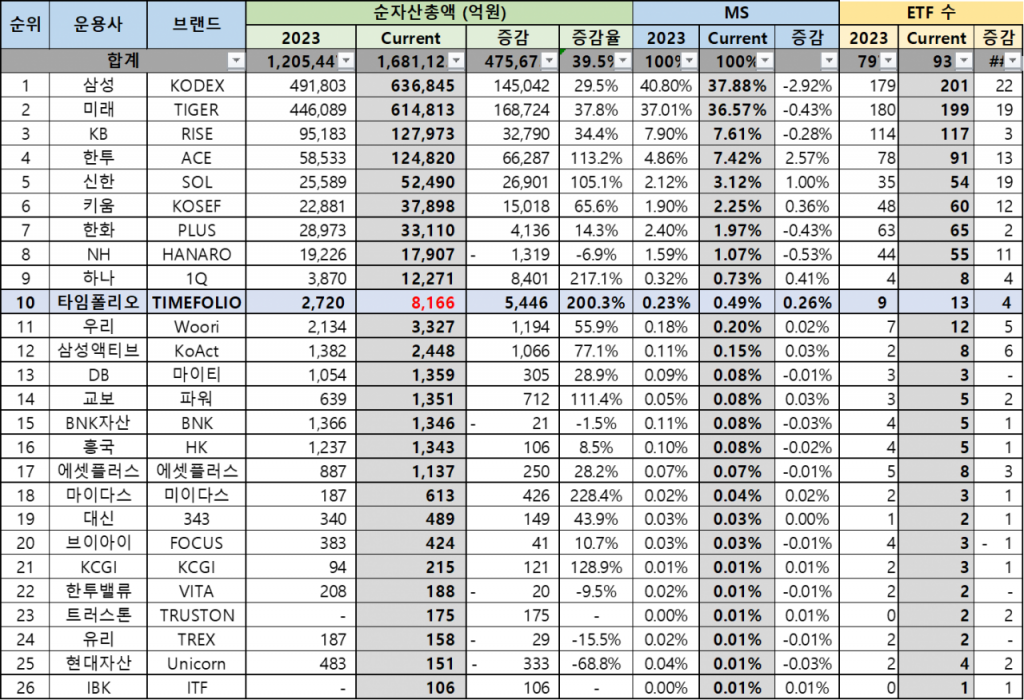 타임폴리오자산운용은 5일 기준 ETF 순자산총액(AUM)이 8100억 원을 돌파하며, 연초 대비 약 3배 증가했다고 6일 밝혔다.