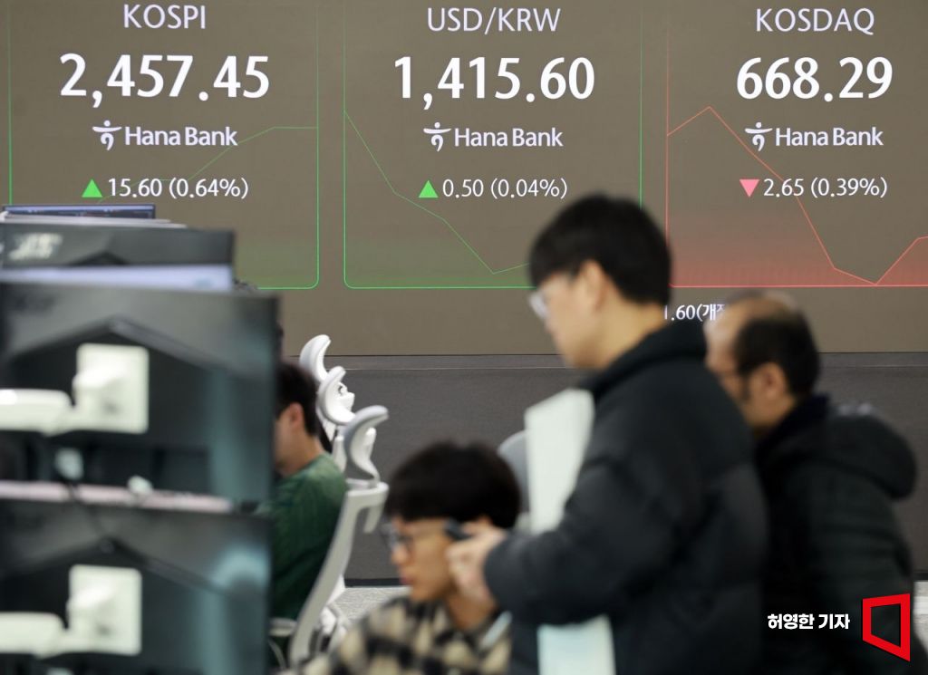 미국 증시가 상승세 끝에 숨고르기에 들어가 하락 마감한 뒤 6일 국내 증시는 소폭 상승 출발했다. 코스피는 9.75포인트 오른 2451.60포인트로 시작했고 코스닥은 소폭 내렸다. 원달러 환율은 소폭 상승해 1416원으로 개장했다. 서울 을지로 하나은행 본점 딜링룸에 주가 등 각종 지수가 표시되고 있다.
