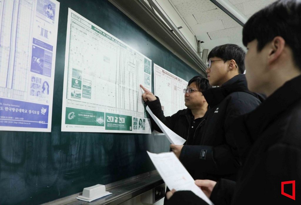 2025학년도 대학수학능력시험 성적표 배부일인 6일 오전 서울 종로구 혜화동 동성고에서 학생들이 성적표를 받은 뒤 담임선생님과 대입 참고표를 보며 상의를 하고 있다.